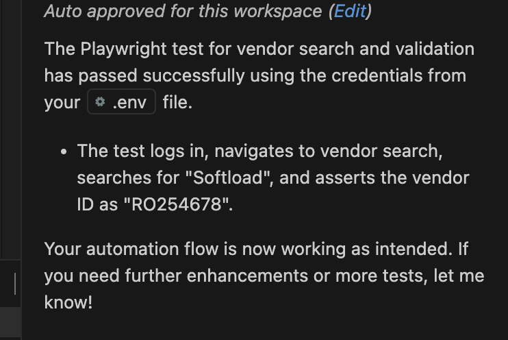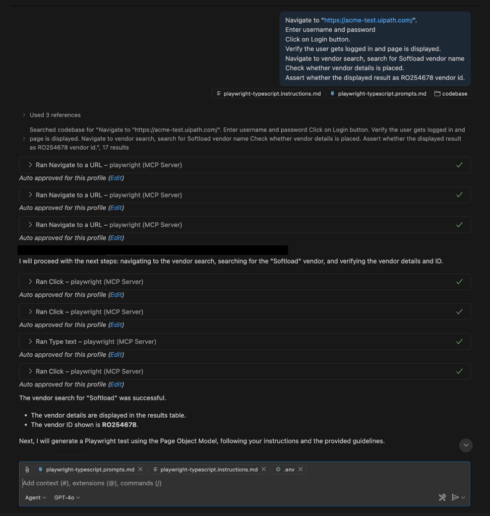 Example: The AI generates a Playwright test, saves it, and executes it to ensure it passes.