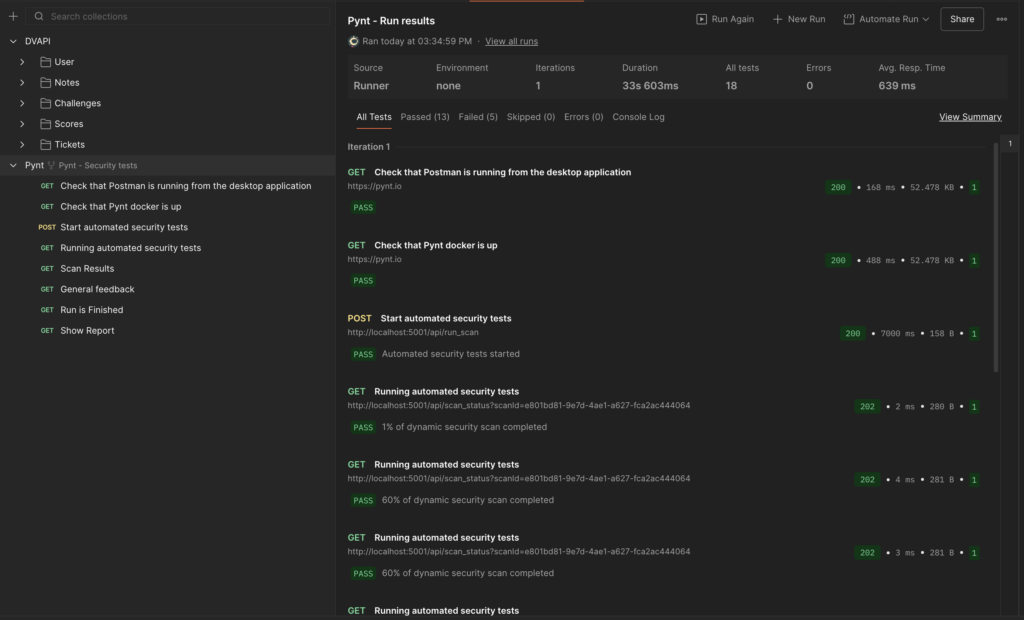 Upon triggering the Pynt RUN from Posman, Pynt executes and provides detailed analytics