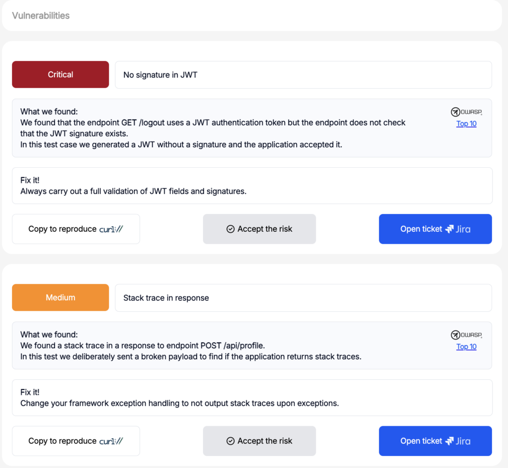 | Test coverage | API OWASP TOP 10 Vulnerability Coverage |
